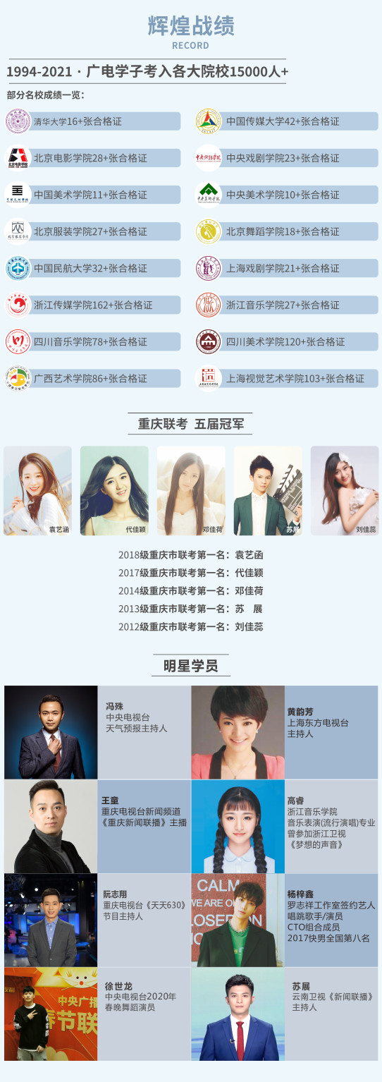 主要開(kāi)展播音主持、表演、音樂(lè)、舞蹈、編導(dǎo)、攝影等高考培訓(xùn)課程,行課期間在校內(nèi)上課,寒暑假及高考集訓(xùn)在重慶主城本部上課,80%以上的專業(yè)過(guò)關(guān)率。
