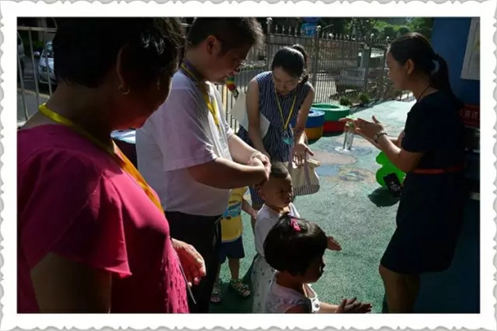 8點(diǎn)40分,我們的家長(zhǎng)準(zhǔn)時(shí)帶著寶寶入園簽到、消毒,同時(shí)我們發(fā)放參觀證,進(jìn)行分組。
