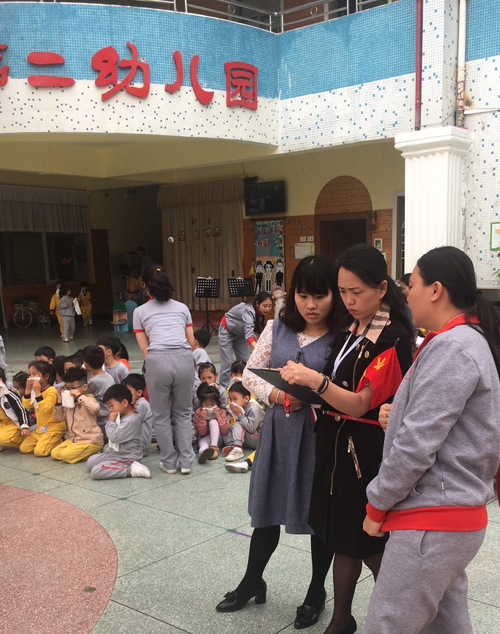 全體師生和幼兒安全撤離到操場后,各班老師迅速 開始清點幼兒逃生人數(shù),確保每一位幼兒都已經(jīng)安全撤離,并向總指揮上報本班的幼兒總?cè)藬?shù)以及今天逃生人數(shù)。