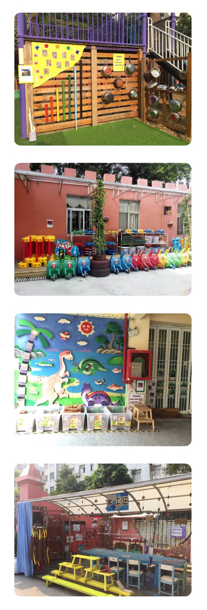 聲音探索區(qū)、器械區(qū)、攀爬墻、木工區(qū),是孩子們非常喜歡的戶外區(qū)域,在這里能帶給大家更多的創(chuàng)造空間與樂趣。