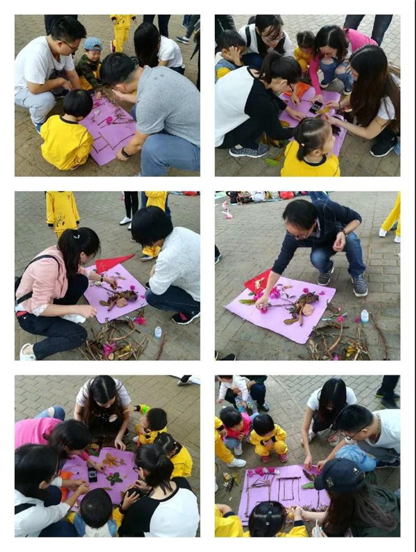 第二個環(huán)節(jié)是以大自然為主題,按小組為單位撿自然材料與爸爸媽媽共同完成一幅作品,比比誰的最好看!