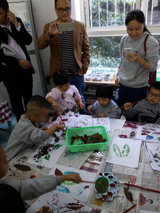 看!我們在用樹葉印畫,爸爸媽媽看的比我們還認(rèn)真!