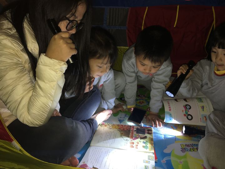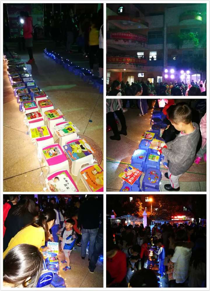 故事劇場(chǎng)結(jié)束后,換書(shū)大會(huì)接著就開(kāi)始了!這邊用一排排的小板凳用彩燈圈起來(lái),就像一只只螢火蟲(chóng)圍繞著。在板凳上面放著孩子們提供作為交換的好書(shū)。小朋友在家長(zhǎng)的帶領(lǐng)下一手拿著換書(shū)券,一手拿著手電筒穿梭在一排排的書(shū)本中,孩子們?cè)诩议L(zhǎng)的來(lái)領(lǐng)下認(rèn)真地翻閱著,都希望能夠找到心儀的書(shū)。孩子們兌換到圖書(shū)后,和家長(zhǎng)一起進(jìn)行“帳篷夜讀”,顧名思義就是走進(jìn)帳篷,手持手電筒閱讀換到的圖書(shū)。哇!真是太有意思了!這給孩子創(chuàng)造不一樣的閱讀氛圍,也讓幼兒收獲不一樣的閱讀樂(lè)趣。