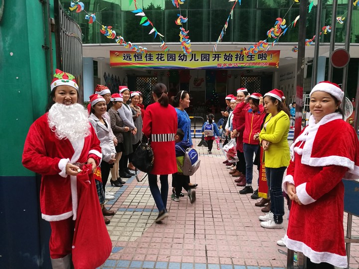 瞧!圣誕老人在校門口發(fā)禮物了。