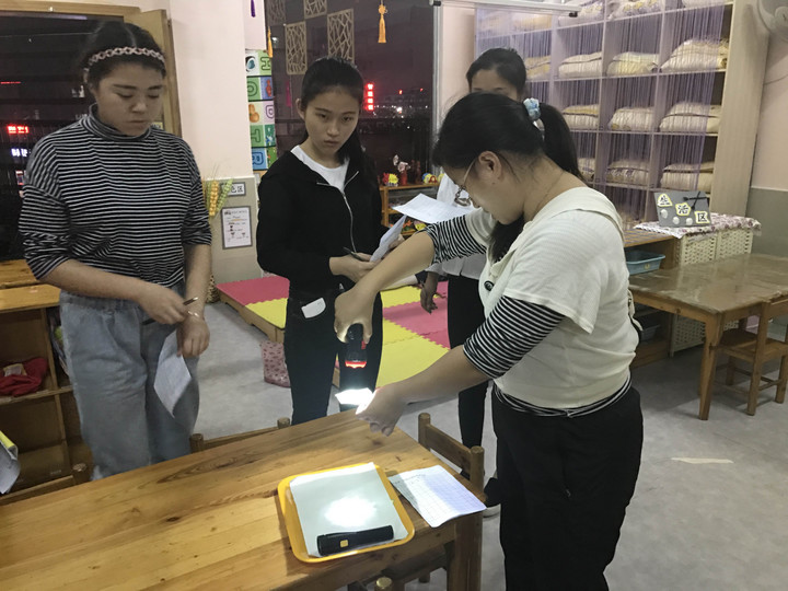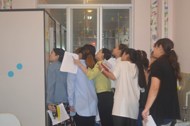老師們在對班級的精粹化——標識到位、物品與標識擺放是否一致進行核實