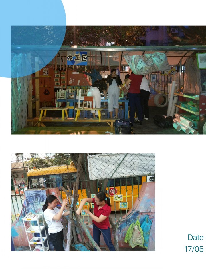 大班級組:承擔了木工區(qū)、玩水區(qū)、表演區(qū)的環(huán)境創(chuàng)設(shè)與材料的投放。木工區(qū)根據(jù)中大班幼兒的發(fā)展及年齡特點,提供錘子、釘子、鉗子等工具讓幼兒進行一些拆、裝、拼等活動,鍛煉幼兒的手部肌肉和精細動作的發(fā)展,并提供一些木工膠水、螺絲釘、護目鏡、手套和與木工相關(guān)的書籍。