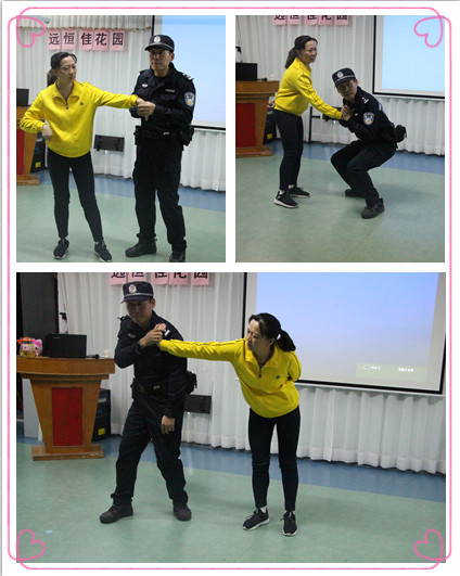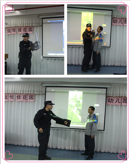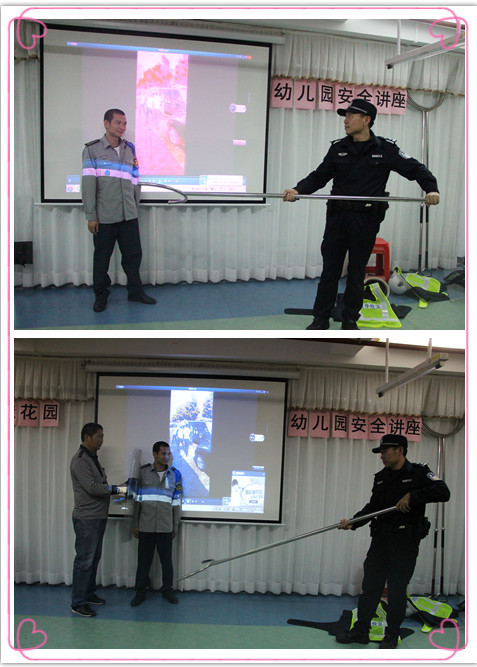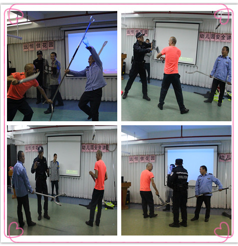 首先,劉教官對于我們身邊的沃爾瑪恐怖事件、羅湖砍殺事件、寶安區(qū)519等暴力事件進行了視頻播放和詳細分析,不僅讓全體教職員工深切體會到了暴力事件的可怕性,而且提高提高了教職工的反恐防暴意識。然后,劉教官分別對于保安和教師的反恐防暴技巧進行了演示指導。例如,讓一名保安扮演暴力嫌疑人,對鋼叉和防暴盾牌的使用方法進行了指導和演示;老師扮演受害者,演示如何進行自我保護。最后,針對幼兒園的實際情況對反恐防暴提出了以下幾點注意事項:一、一旦有危險人物或暴徒闖入,教師不要慌,一定要保持冷靜;二、關緊門窗,盡量把孩子與危險人物隔離開,將幼兒隱蔽起,避免近距離接觸,引起傷害;三、一定要想辦法拖延時間,等待救援,盡量避免身體正面接觸,引起不必要的傷亡;四、一旦發(fā)生意外事件,馬上報警,將傷害降到最低程度。
