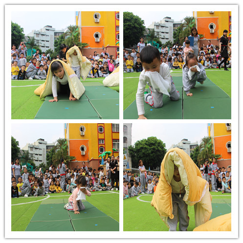 中班幼兒進行匍匐前進法和棉被護身法這兩種自救方法的演練
