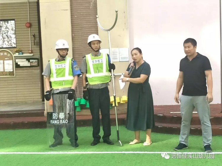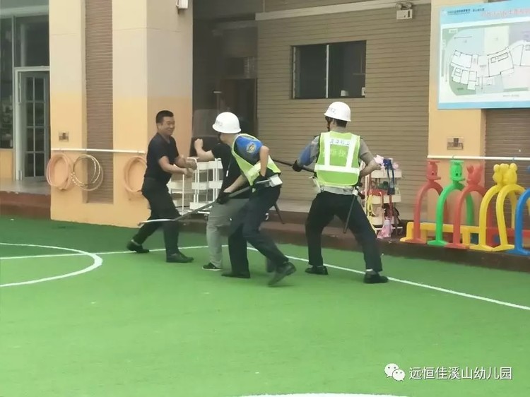 同時,幼兒園應急小組緊急行動,按防暴應急預案要求手持棍棒、鋼叉等,將“歹徒”圍住,與“歹徒”交涉、周旋,設(shè)法牽制“歹徒”,竭力保護幼兒安全。
