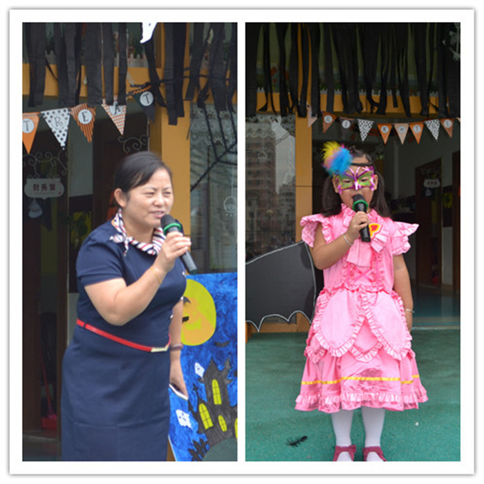 活動(dòng)的第一個(gè)環(huán)節(jié),“淘氣鬼”賣(mài)萌,小朋友們都穿著奇裝異服,跟著音樂(lè)的節(jié)奏萌萌的走了一場(chǎng)別具一格的秀。全園的孩子站在一起時(shí)場(chǎng)面是非常壯觀的呀!既然是西方的節(jié)日,那就少不了語(yǔ)言是滲透啦,英語(yǔ)老師邀請(qǐng)了萬(wàn)圣節(jié)的幾個(gè)突出的角色裝扮的小朋友,讓孩子們一起認(rèn)識(shí)這些角色的英語(yǔ)怎么說(shuō),孩子們學(xué)得可認(rèn)真啦!最搞笑的要數(shù)老師的游戲“瘋狂木乃伊”啦,看著每個(gè)級(jí)組的老師代表在臺(tái)上合作將另一個(gè)老師包成“木乃伊”孩子們都很激動(dòng),紛紛給自己的老師加油,讓整個(gè)活動(dòng)達(dá)到了高潮。