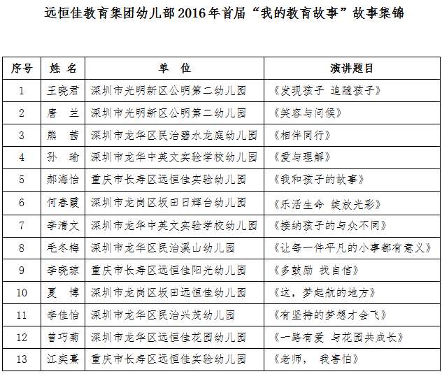 隨著深圳市讀書月的徐徐落幕,2016年11月30日,天高氣爽,鵬城上空、龍華中英文實驗學(xué)校的校園彌漫著濃濃的書香……這一天深圳市遠(yuǎn)恒佳教育集團(tuán)幼教中心組織舉辦了首屆“我的教育故事”演講展示,活動以集團(tuán)幼兒部“蒲公英早期閱讀特色教育方案”為依據(jù),以“講教育故事”為面、以“閱讀美好人生”、“書寫教育華章”為點,弘揚集團(tuán)“重文化”之精神,共享美好教育之歷程,展示師者之靚麗風(fēng)采。集團(tuán)幼教中心領(lǐng)導(dǎo)、教研員、各園園長、行政、老師、家長代表約200人參加了活動。