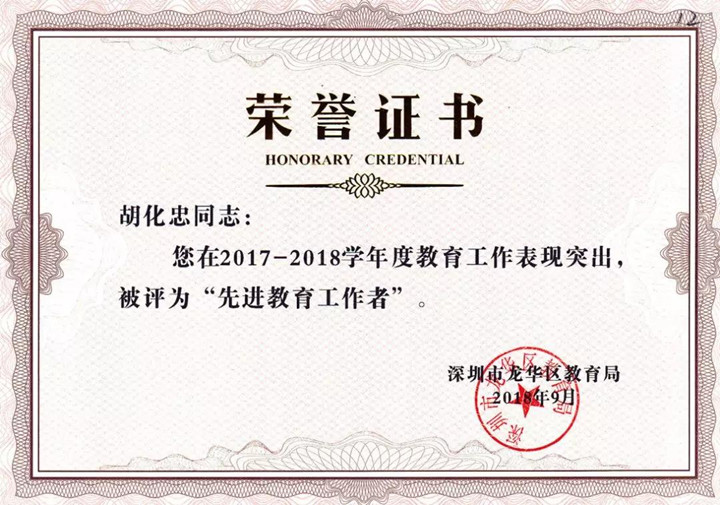 龍華區(qū)先進(jìn)工作者獲得者:胡化忠副校長