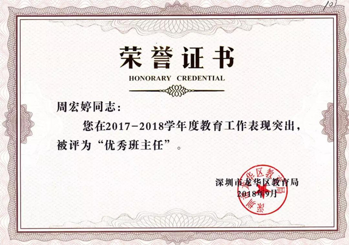 龍華區(qū)優(yōu)秀班主任獲得者:周宏婷老師