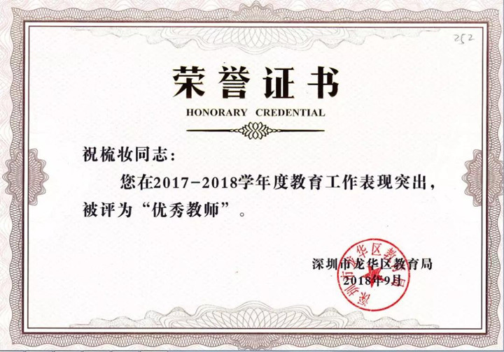多次被評為龍華區(qū)“優(yōu)秀班主任”、“優(yōu)秀教師”,在龍華區(qū)舉行的“卓越課堂”的設(shè)計(jì)和比賽中分獲一、二等獎。龍華區(qū)首屆教師綜合素質(zhì)大賽區(qū)總決賽中分別獲二、三等獎。輔導(dǎo)的學(xué)生多次在龍華區(qū)“規(guī)范漢字書寫”一等獎和“我喜愛的課外書演講比賽”一等獎。