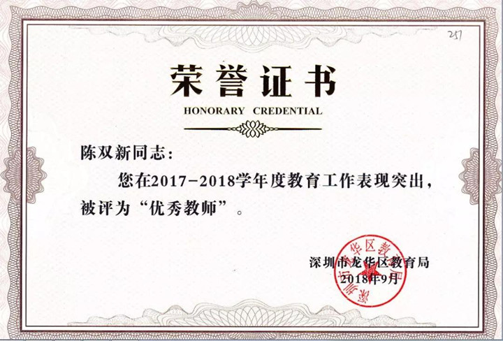龍華區(qū)優(yōu)秀教師獲得者:陳雙新老師