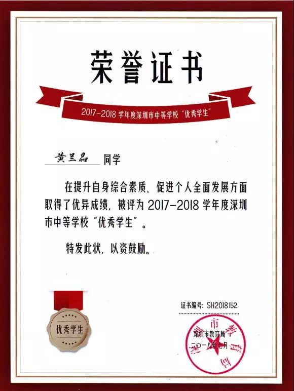 2017-2018學(xué)年度深圳市中等學(xué)?!皟?yōu)秀學(xué)生”獲得者:黃蘭晶同學(xué)