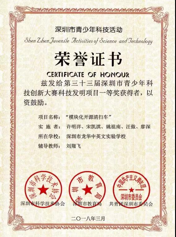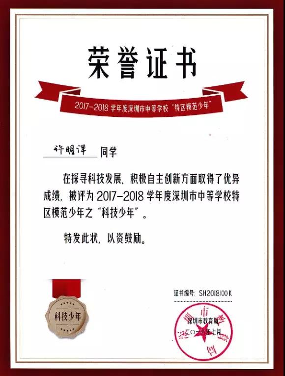 2017-2018學(xué)年度深圳市中等學(xué)校特區(qū)模范少年之“科技少年”獲得者:許明洋同學(xué)