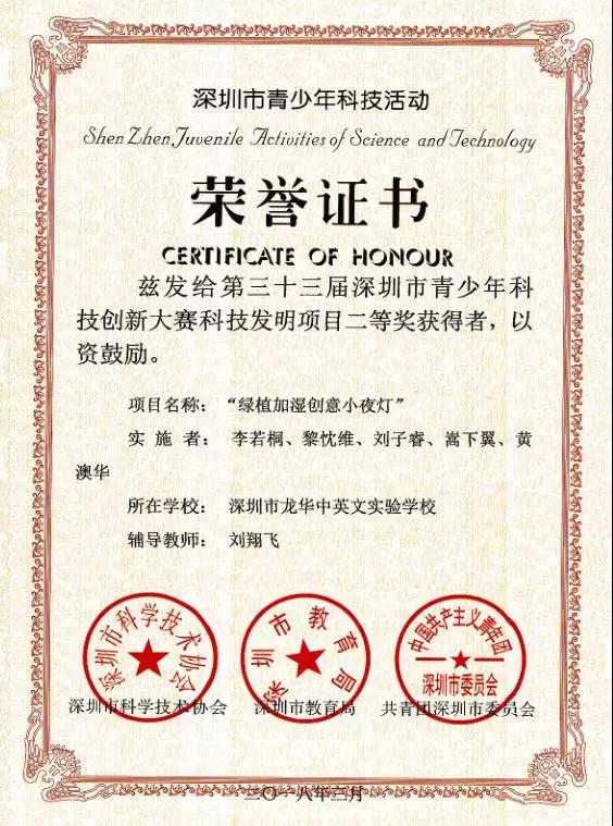 第33屆深圳市青少年科技創(chuàng)新大賽科技發(fā)明項(xiàng)目二等獎獲得者:李若桐、黎忱維、劉子睿、嵩下翼、黃澳華