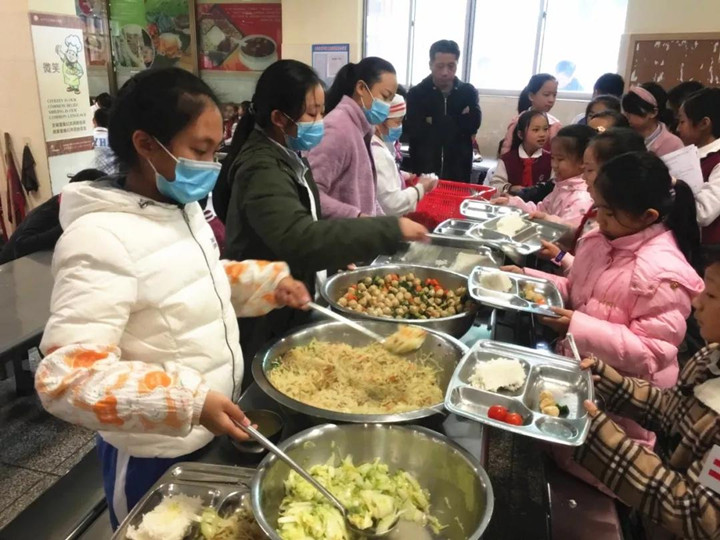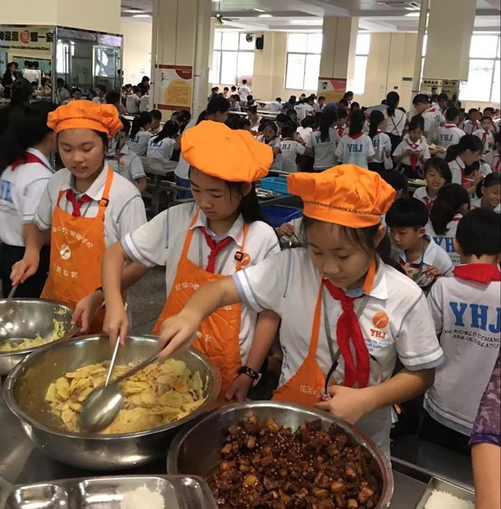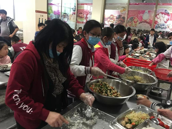 為同學(xué)們分菜:你一勺,我一勺,分工合作很到位