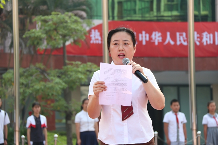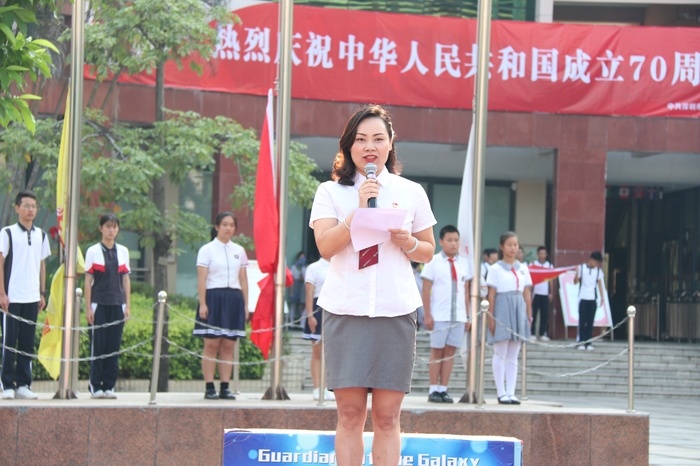 學(xué)校金玉善副校長進(jìn)行了國旗下的講話。她首先表達(dá)了在偉大祖國70華誕來臨前,在莊嚴(yán)而又神圣的五星紅旗下講話的激動心情,簡要地向師生員工描述了革命先烈拋頭顱、灑熱血才換來我們今天美好生活的革命歷程,以及新中國成立以來創(chuàng)造的偉大而輝煌的成就。同時(shí)要求同學(xué)們珍惜今天來之不易的幸福生活,要胸懷祖國、勤奮學(xué)習(xí)、熱愛生活、遵紀(jì)守禮,做一名新時(shí)代的優(yōu)秀學(xué)生!