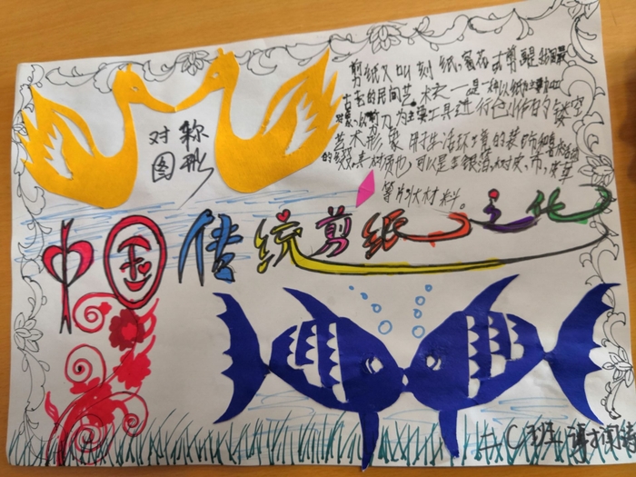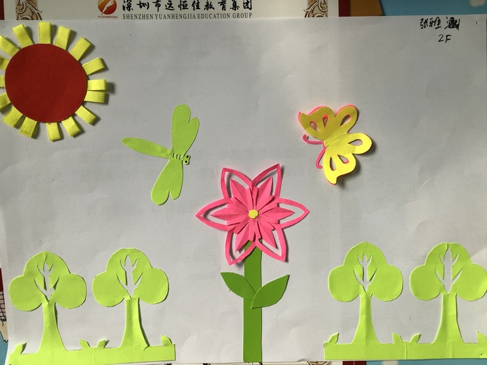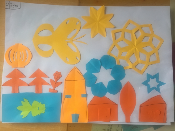 運(yùn)用數(shù)學(xué)課上學(xué)習(xí)的“對(duì)稱圖形原理”剪出各種圖案,并創(chuàng)意粘貼成畫,既鼓勵(lì)孩子們充分發(fā)揮想象力和創(chuàng)造力,又滲透?jìng)鞒兄袊?guó)傳統(tǒng)剪紙文化,一舉多得。