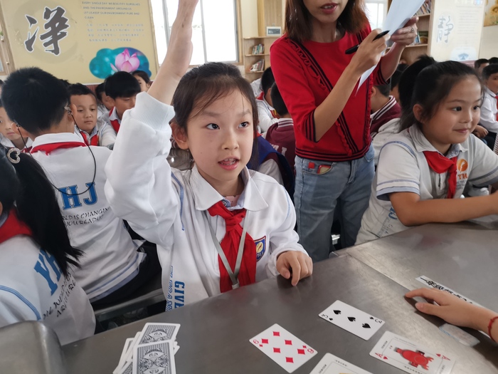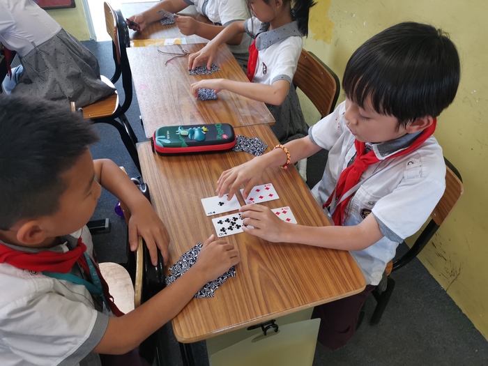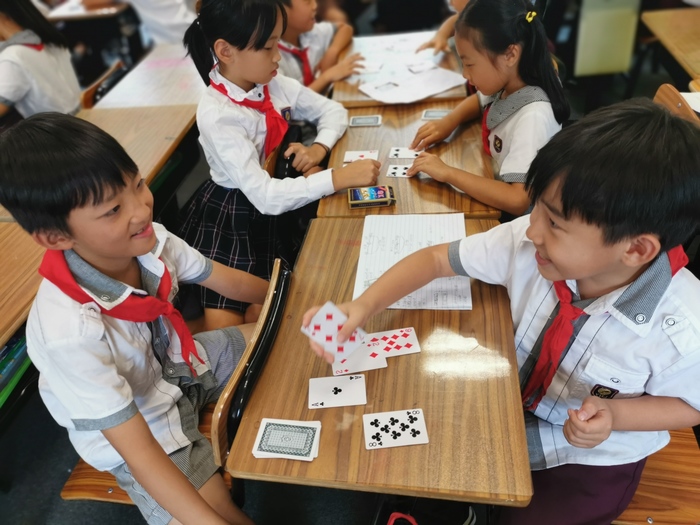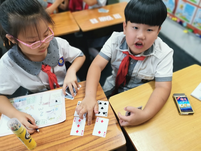 剛剛開(kāi)啟兩個(gè)月學(xué)習(xí)生活的小一學(xué)生,使用“數(shù)學(xué)排序”思維做游戲,以最快的速度翻出1-9的數(shù)字紙牌。孩子們眼神專注,興趣盎然。