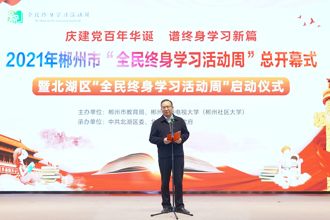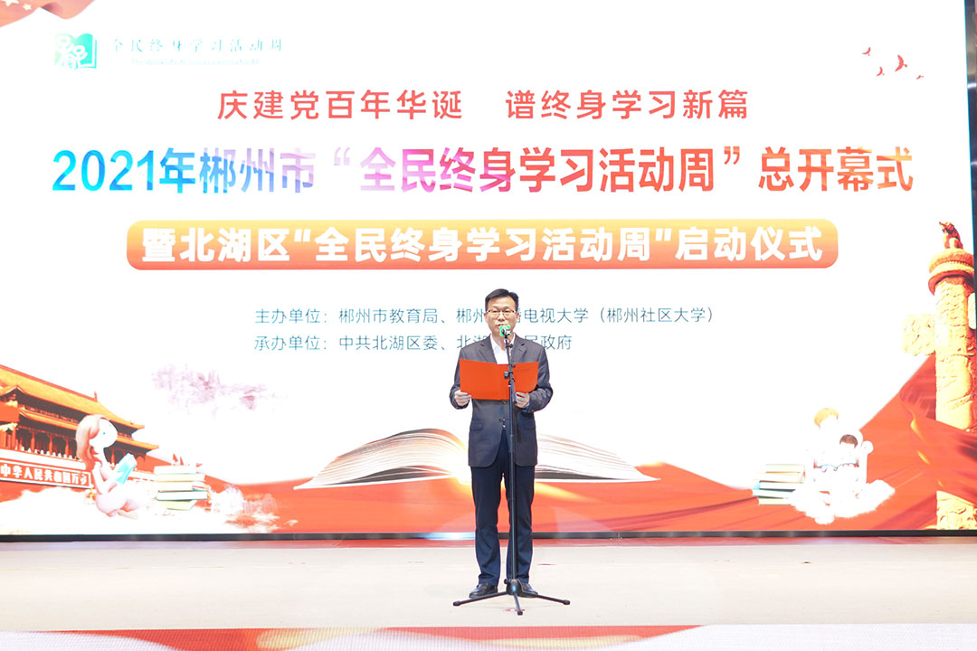 本次活動(dòng)由郴州市教育局、郴州廣播電視大學(xué)(郴州社區(qū)大學(xué))主辦,中共北湖區(qū)委、北湖區(qū)人民政府承辦。郴州市人民政府副市長(zhǎng)周海林,湖南開放大學(xué)副校長(zhǎng)吳敏,郴州市教育局黨委書記、局長(zhǎng)肖正科等出席開幕式。北湖區(qū)相關(guān)區(qū)級(jí)領(lǐng)導(dǎo)、各縣市區(qū)教育局局長(zhǎng)及社區(qū)學(xué)院主要負(fù)責(zé)人、社區(qū)學(xué)校代表、受表彰的先進(jìn)集體和個(gè)人等參加開幕式。郴州市政府副秘書長(zhǎng)蔣利民主持開幕式。
