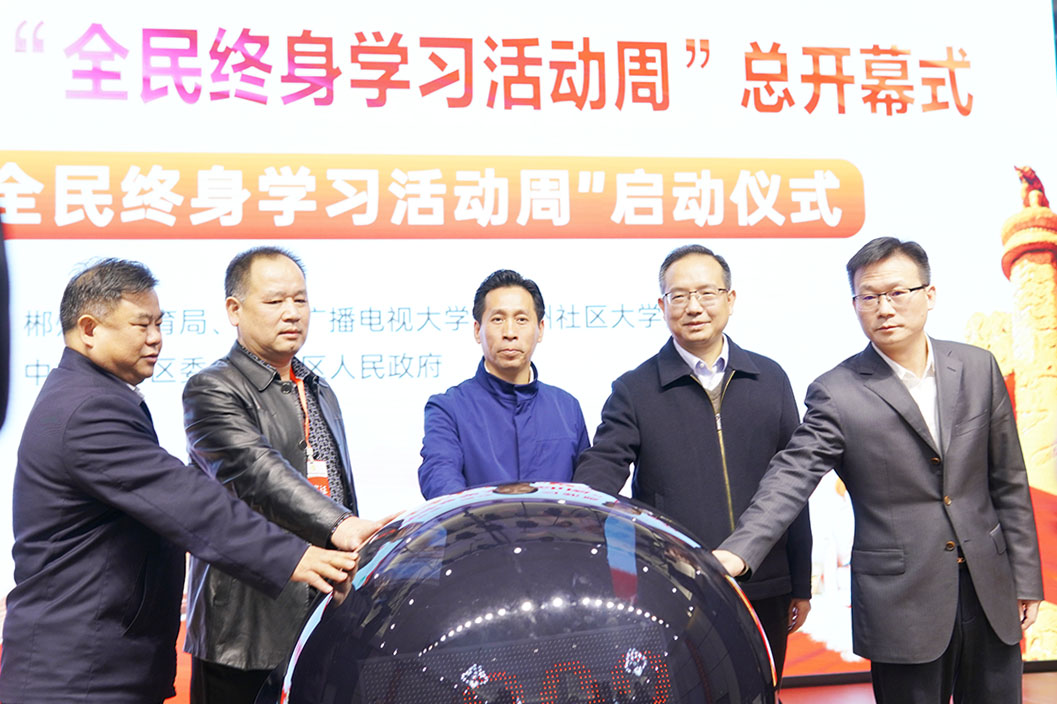 參會(huì)領(lǐng)導(dǎo)嘉賓觸摸啟動(dòng)球,2021年郴州市“全民終身學(xué)習(xí)活動(dòng)周”全市總開幕式暨北湖區(qū)啟動(dòng)儀式活動(dòng)圓滿成功。