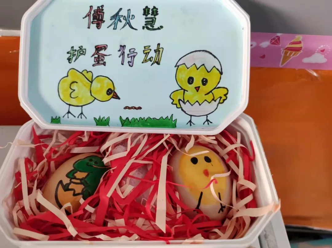 初為“爸媽”,孩子們自然是小心翼翼。原本風(fēng)風(fēng)火火上學(xué)的孩子,連上車都變得動(dòng)作緩慢;到了學(xué)校,大家紛紛把自己的“蛋寶寶”拿出來,互相欣賞對(duì)方的雞蛋,并熱烈討論著怎么更好地保護(hù)它;平時(shí)下課就嬉戲打鬧的孩子不見了,他們都小心翼翼地護(hù)著自己口袋里的“蛋寶寶”,生怕因?yàn)樽约旱拇中淖岆u蛋破碎;大家就連吃飯都變得格外小心,生怕把它碰碎了。