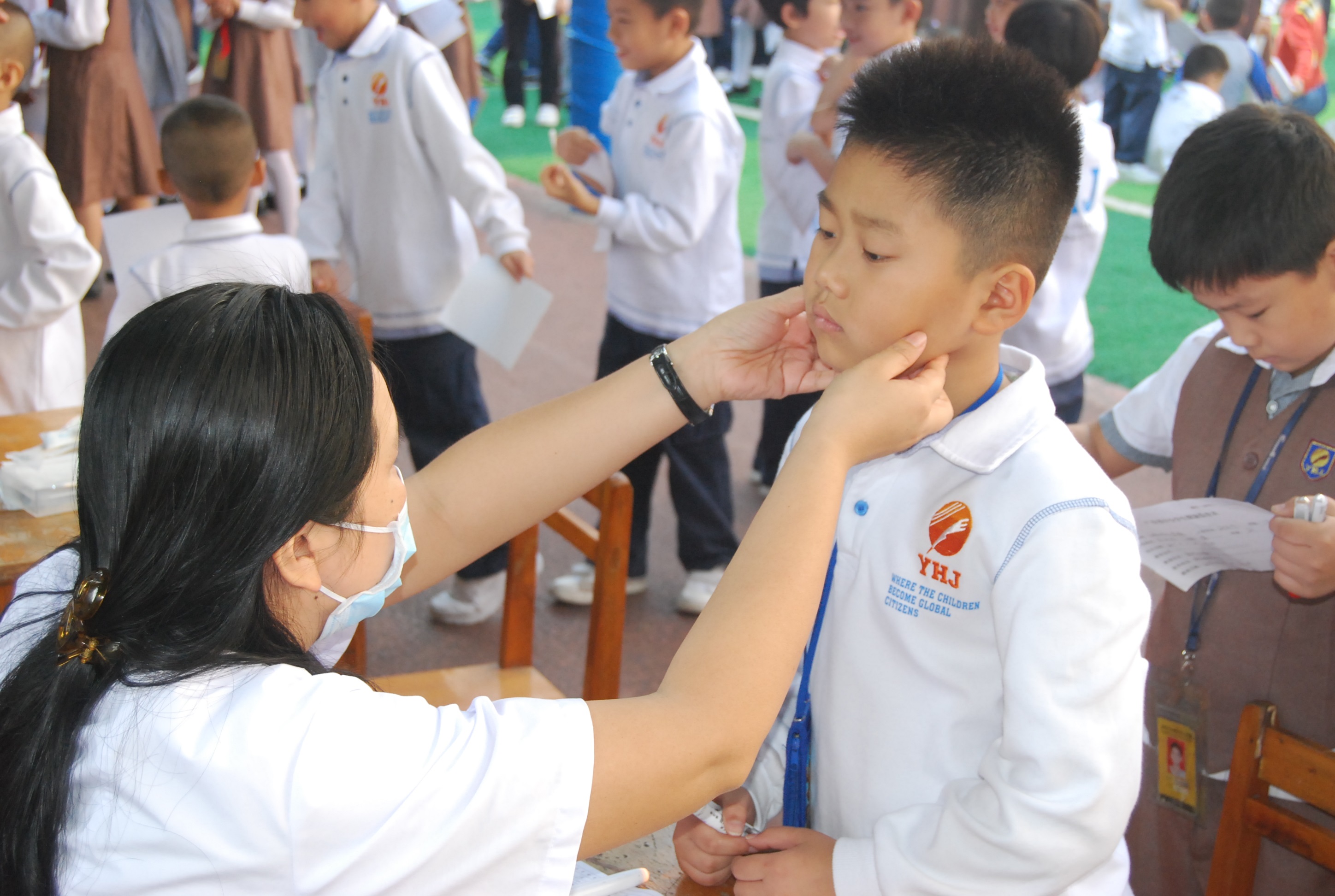 為了解學(xué)生的身體健康狀況和生長發(fā)育水平,2016年11月7日上午,新區(qū)社康服務(wù)中心的白衣天使們來到公明中英文學(xué)校,市區(qū)疾控中心領(lǐng)導(dǎo)親自到現(xiàn)場指導(dǎo),為孩子們做了一次認(rèn)真細(xì)致的身體健康檢查。學(xué)校后勤部做了周密的安排,普通部六年級在年級主任和班主任組織下,同學(xué)們積極地搬好體檢用的桌凳,做好了充分準(zhǔn)備。