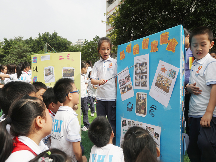 作為一所民辦學(xué)校,公明中英文學(xué)校的外來工子女占到90%之多,為讓孩子們盡快適應(yīng)、喜歡、融入這座城市,本學(xué)期該校選擇了“多彩深圳”這一主題做為主題方案學(xué)習(xí)內(nèi)容。主題確定后,各年級圍繞該主題再選擇子主題,比如一年級選擇景點、二年級選擇美食、三年級選擇交通、四年級選擇建筑等,然后各班再根據(jù)年級主題采用頭腦風(fēng)暴確定展示的內(nèi)容、方式和任務(wù)分工。朋友間交流、向家長請教,上網(wǎng)絡(luò)查詢,同學(xué)們通過各種方式收集、整理相關(guān)內(nèi)容,并通過手抄報、繪本的形式制做主題展板?;顒赢斕欤敻靼嗟恼拱宄尸F(xiàn)在師生家長面前時,整個展區(qū)匯成了一個五彩斑瀾的知識海洋。“這是深圳的知名企業(yè),騰訊、華為……”,“地王大廈正式名為信興廣場……,創(chuàng)造了世界超高層建筑最“扁”最“瘦”的世界紀錄”,孩子們在展位前如數(shù)家珍,向師生家長介紹深圳的各種特色,吸引了大批的參觀者駐足了解。三D班制做的深圳機場模型,維妙維肖,做工精致,不少家長拿出手機拍照留念。而四年級設(shè)制的有獎問答,只要答對問題,便能得到一份現(xiàn)場制做的美食,吸引同學(xué)們排起了兩條長龍。(文、程?。?span>