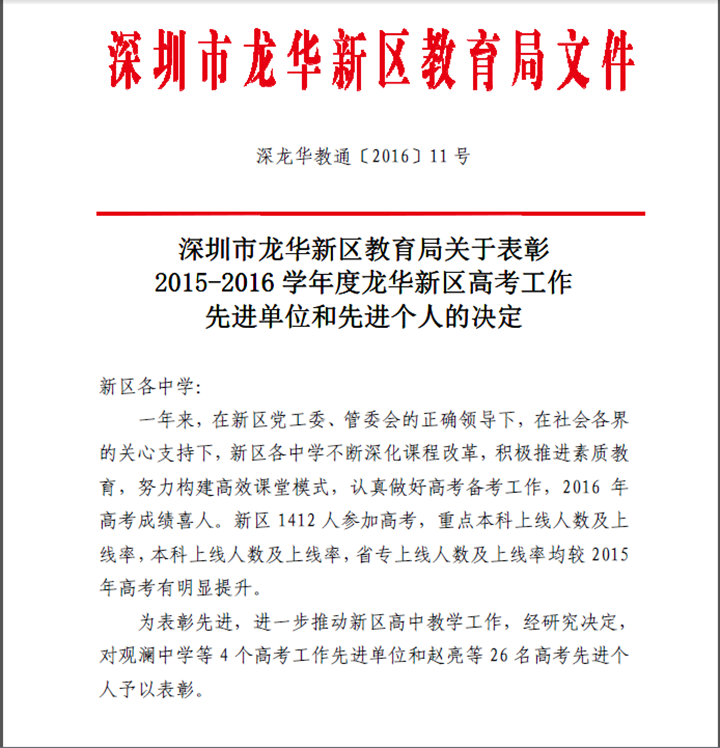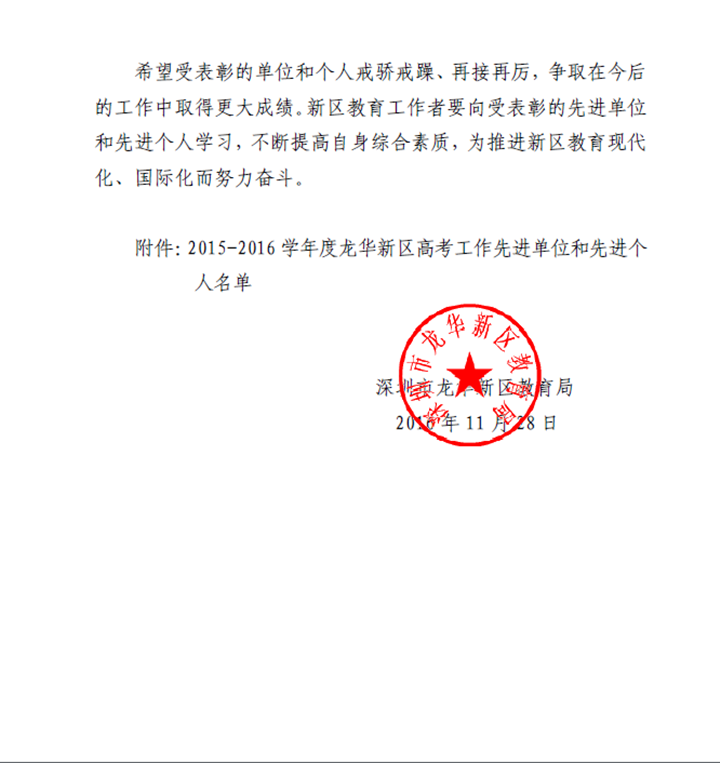 龍華中英文實(shí)驗(yàn)學(xué)校獲“深圳市龍華新區(qū)2016年高考先進(jìn)單位”稱號(hào)