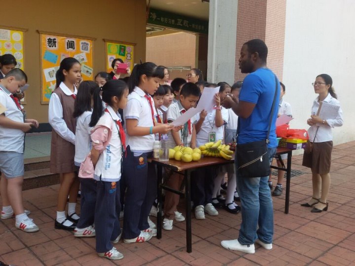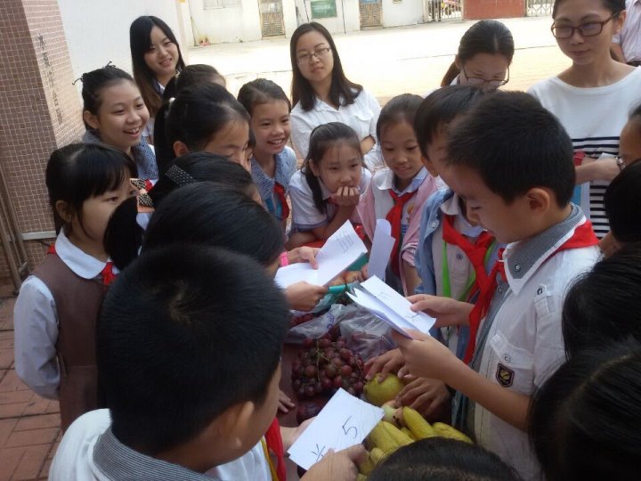 2016年10月10日上午,外教Antony在教學樓廣場上布置水果攤位,組織五A班學生買賣水果,讓孩子們在生活情景中運用英語口語。前來觀摩的老師們興致勃勃地融入到孩子們的活動中,主動與孩子們用英文對話。雖然孩子們?nèi)⒄Z交流有些吃力,但他們還是非常努力地用英文完成了水果的售賣與購買的交際活動,整個過程開心無比。(文、圖/莫三愛)