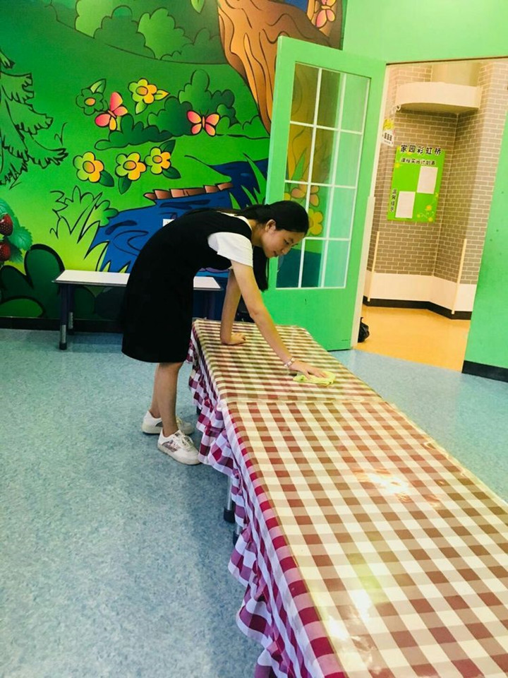 5、每天用消毒水拖教室的地板、公共區(qū)域的地板、餐廳的地板,再用清水拖一遍。
