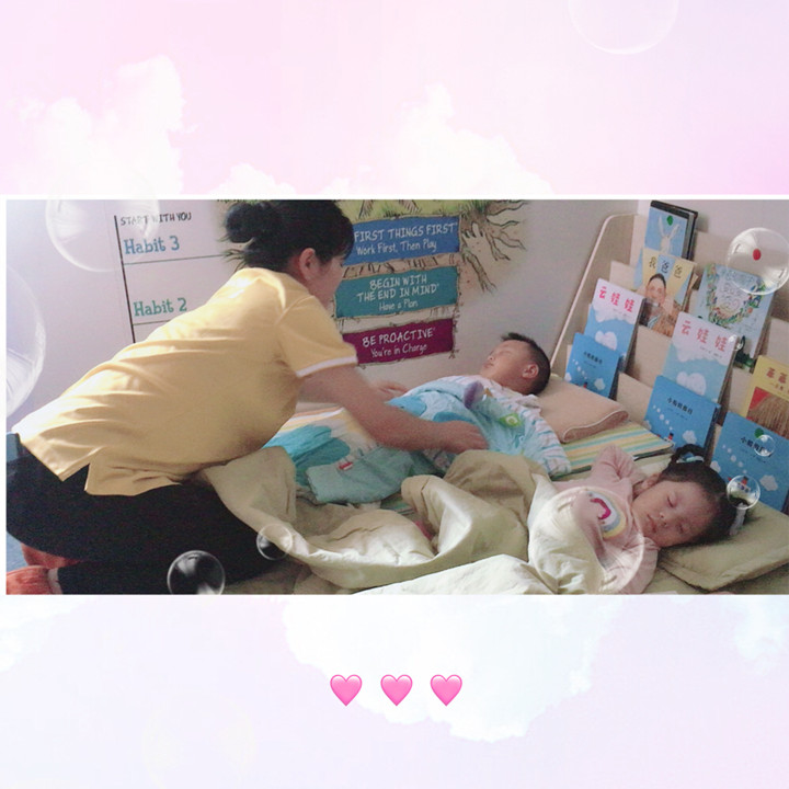 午睡時,會進(jìn)行午檢,從體溫口腔五官身體,及時發(fā)現(xiàn)不舒服的寶寶;孩子入睡時,班級老師會進(jìn)行巡視,并幫孩子蓋好被子,以防著涼。