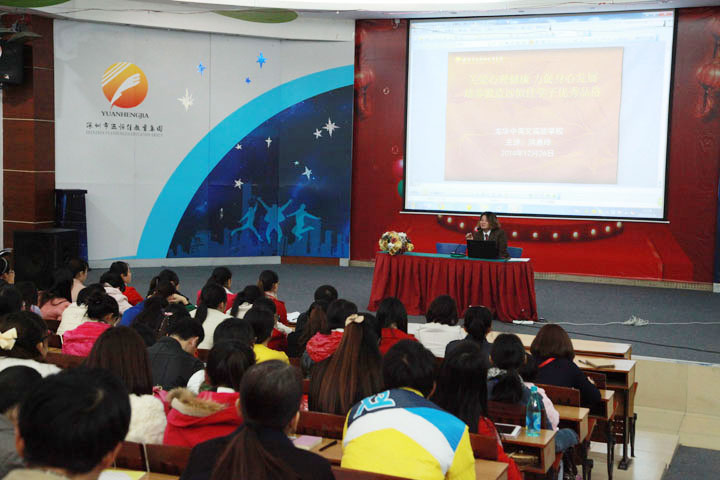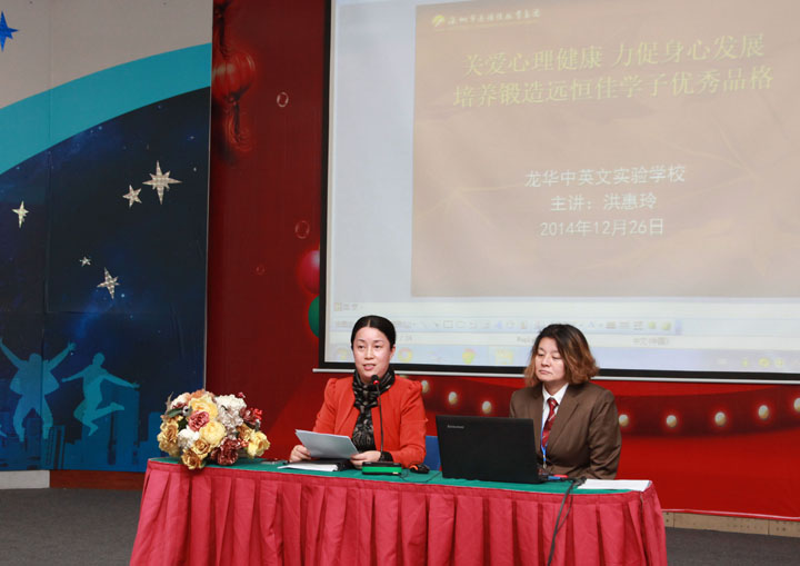 2014年12月26日下午,龍華中英文實驗學校舉辦“關愛心理健康,力促身心發(fā)展,培養(yǎng)鍛造遠恒佳學子優(yōu)秀品格”心理健康專題講座,由董事助理、辦公室主任程琳娜主持,加拿大歸國心理學教授洪惠玲作專題講座。專題講座后,組織全體教師共同學習《生命宣言書》。