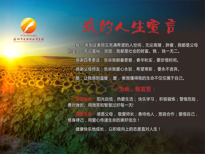 尊重生命: 感恩父母, 敬愛師長; 善待他人, 寬容合作; 愛惜自己, 修身律己, 用愛心傳遞生命的美好信念!
