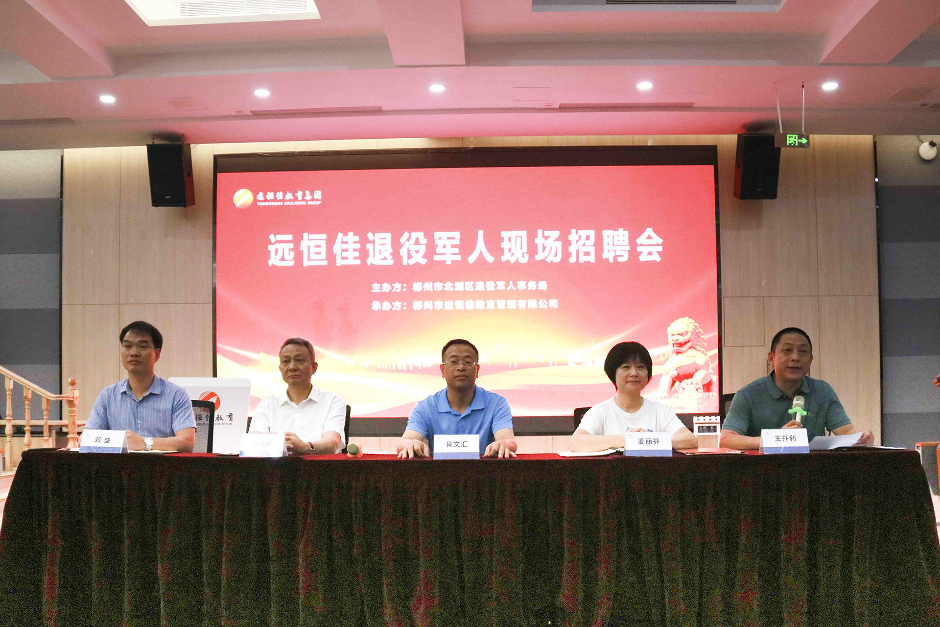 北湖區(qū)退役軍人事務局副局長肖文匯(左三),遠恒佳教育集團黨總支書記、董事長宋遠標(左二),集團董事、副總裁麥麗芬(右二),郴州遠恒佳學校副校長鄧盛(左一)參加招聘會,遠恒佳郴州公司總經(jīng)理王開利(右一)主持招聘會。